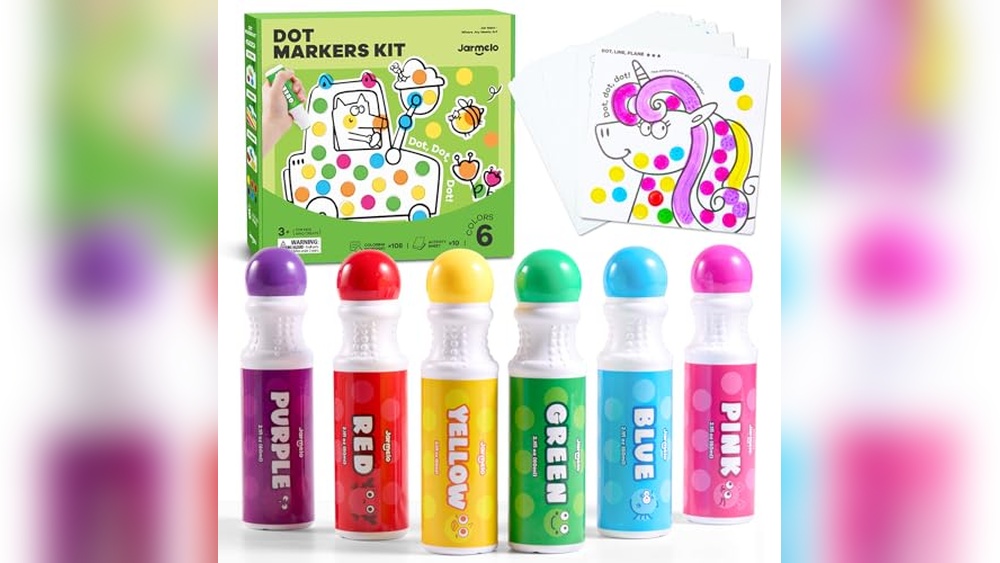 Jar Melo Washable Dot Markers are ideal for toddlers. They come in 6 vibrant colors, are non-toxic, and include 120 printed PDF sheets and 10 activity papers, making them perfect for creative, mess-free fun.