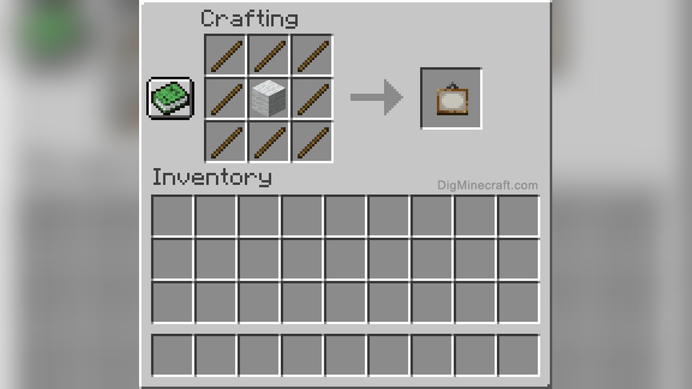 Craft a painting frame in Minecraft by combining eight sticks in a square shape on a crafting table. Place sticks on all sides, leaving the center empty. This creates an item frame to display paintings or maps on walls.